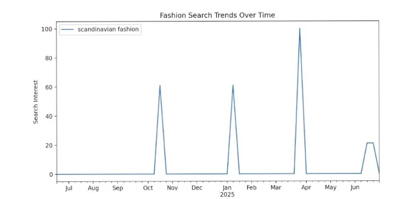 When analyzing Scandinavian fashion search interest over the past year, we found that there were five significant weeks of activity between June 2024 and June 2025. The first spike occurred in October 2024, with interest rising sharply to 61 the week of October 20. The second spike occurred in January 2025, suggesting a return of attention due to many people planning trips for spring break in the coming months and/or attending formal events like weddings. The highest search volume (100) occurred in late March 2025, most likely because spring break was taking place and many people were posting their outfits and inspiration. In June, Scandi searches are once again on the rise, with back-to-back values of 21 showing renewed summer interest. This could be indicating the growing popularity of Scandi-inspired summer looks, such as linens, neutrals, and minimalism. The continuous cycle of spike and plateaus points to potential long-term trend adoption.